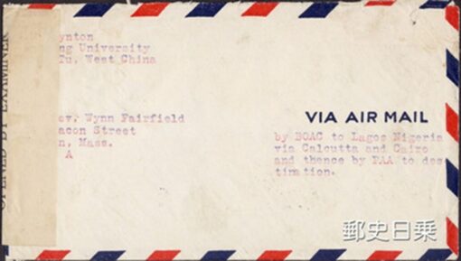 なんと1943年、中国からアメリカ(成都-重慶-カルカッタ-カイロ-ラゴス(ナイジェリア)-ブラジル-トリニダード-マイアミ)へあてた手紙なのである。