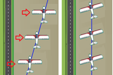 上の画像は、道路なりにまっすぐ飛んでいきたいが、左から横風がある時の例です。機首を左に向けて、まっすぐですが横滑りして飛んでいきます。あれ?