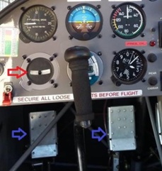 赤い矢印がTurn Coordinator。操縦かんの左右にある青い矢印がラダーペダル