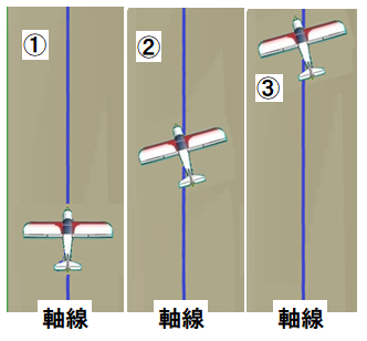 あさってを向いた機首(機体)と翼が作る90度の角度のちょうど真ん中つまり機体(翼)と45度くらいの軸線に滑走路がくるように調整します。