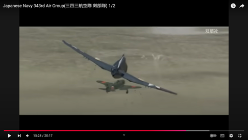 この疑問を解消するのに重要なようつべ動画を発見しました。みなさんご存じ343空が九州だっけ?でグラマンやコルセアを迎え撃った史実を忠実に再現したものですが、この中で被弾により継戦不能になった紫電改が滑走路に降りていくところを敵機に食いつかれ。あわや撃墜!の一瞬に、紫電改は見事な横滑りで敵弾をかわしたのですが、ここでは敵機と同じ軸線上ながら、横滑りによる一瞬の降下で敵弾を上方にそらしています。