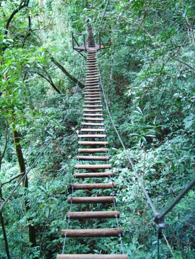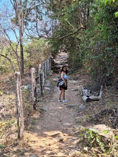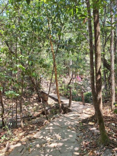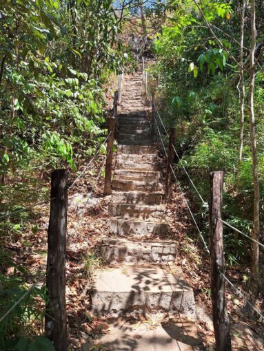 この滝を超えたあたりから、急に道が険しくなり。いちおう階段はあるのですが、天を突くような急峻な崖を、かわいそうに素敵女子の腰まであるような高い一段一段を這うようにして登っていくようになり。