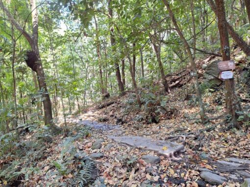 トライルのところどころに、へんな標語が書かれたプラカードが立っており。素敵女子は小学校の先生なので、大喜びで教材にしよう、と撮影しまくっていた。
